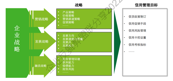 企业战略包括营销战略、发展战略和融资战略,将企业战略细化并与信用管理目标相结合,解析企业信用管理对企业战略的影响,明确企业自身信用管理目标 。