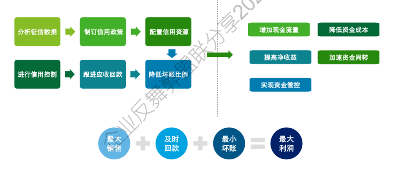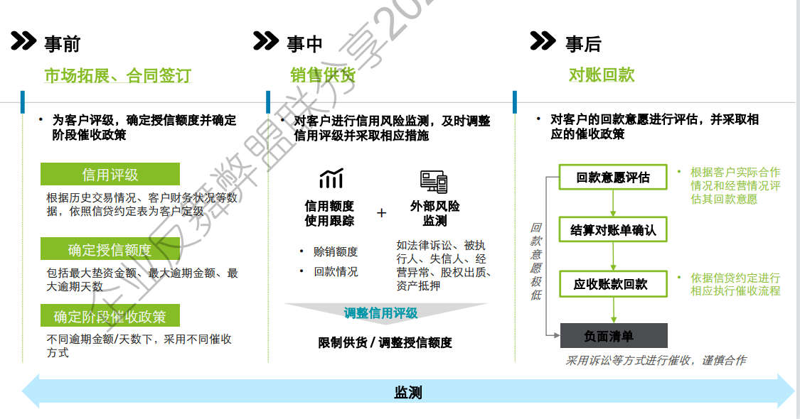 构建数字化信用管理体系,以系统为抓手,实现信控管理事前、事中、事后的闭环管理跟踪,建立预警指标和事项反馈,推动管理变革。 从“事前、事中、事后”阶段实现闭环管理和全流程风险监测,“重管控”“重服务”两手都要抓,把管控理念转变为提高服务的能力,最终达到销售业绩的合理、健康成长。
