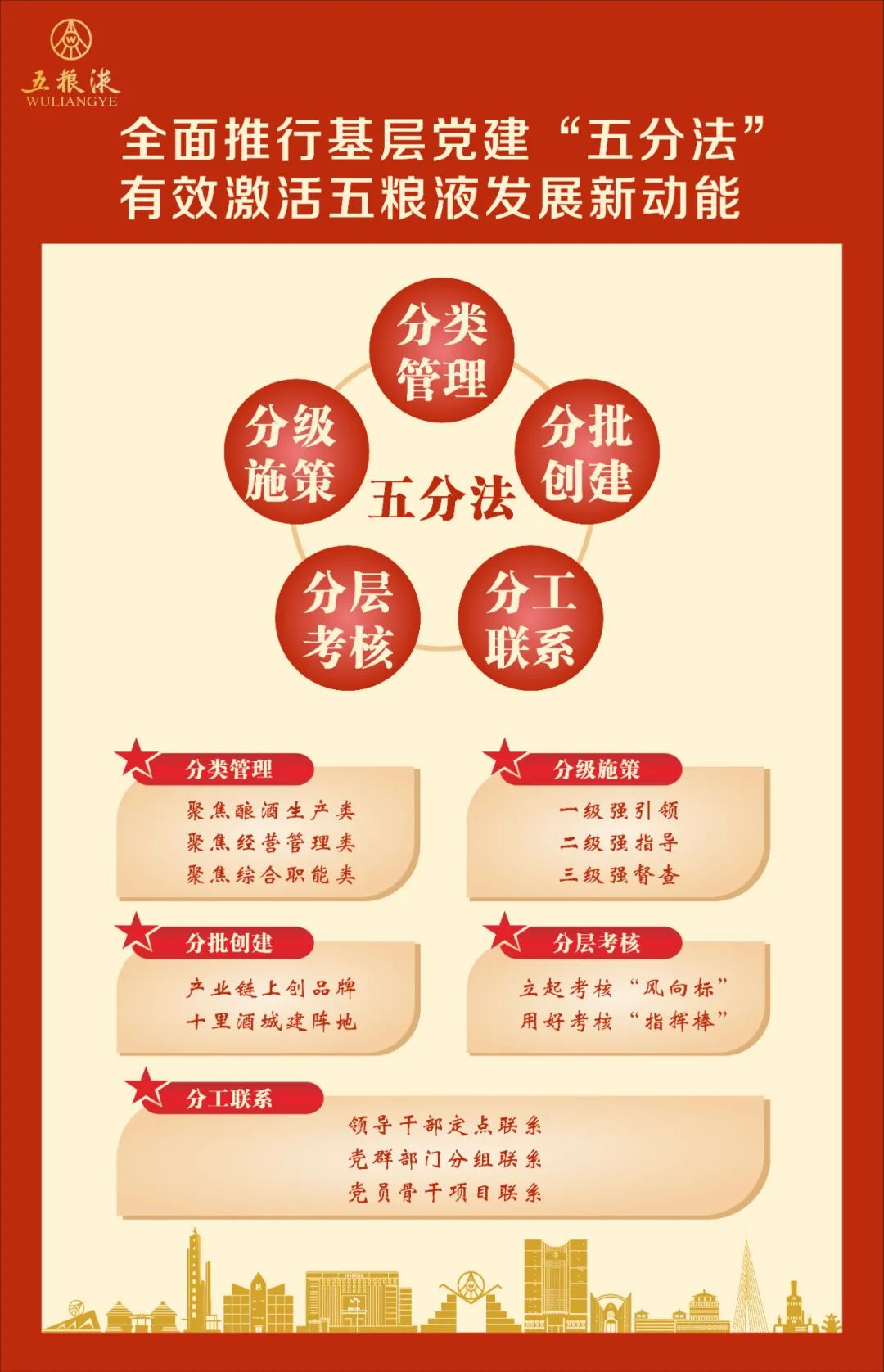 基层党建“五分法”,是以增强基层党组织政治功能和组织功能为目标,立足五粮液多元化的产业体系、多样化的基础条件、差异化的工作现状,紧扣不同层级、不同类型、不同职能、不同领域、不同对象特点,以分类管理为前提、分级施策为原则、分批创建为抓手、分层考核为重点、分工联系为保障,分类化、科学化、精准化推进基层组织建设,以组织赋能激活高质量发展新动能的工作路径。